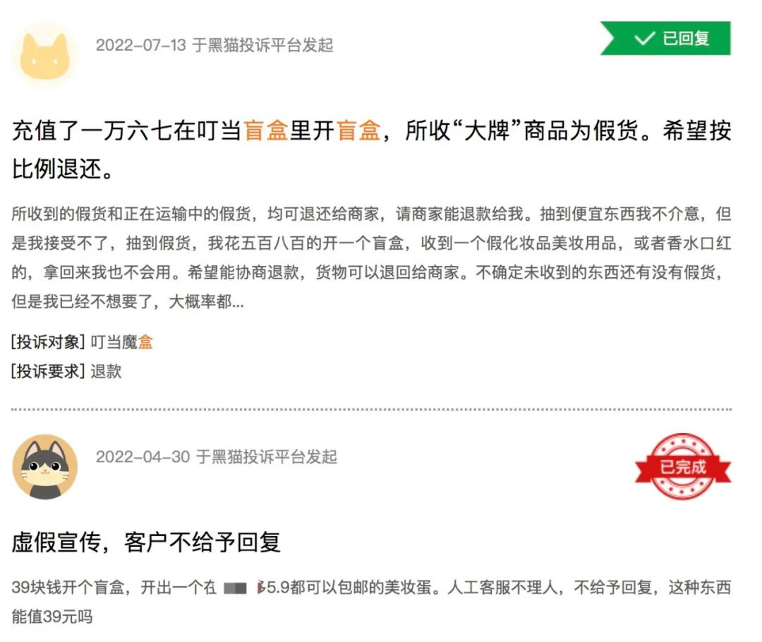 《化妆品观察》查询各平台如新浪旗下消费者服务平台黑猫投诉、小红书了解到,不少消费者曾投诉美妆盲盒中出现的假货、虚假宣称不发货等问题。